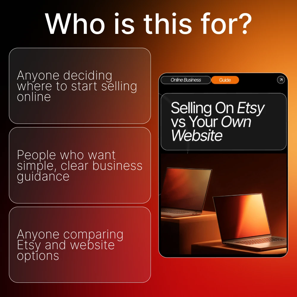 This guide is perfect for Etsy beginners, handmade sellers, digital creators, ecommerce beginners, and small business owners trying to decide between selling on Etsy or building a standalone website. If you want clarity, confidence, and a strategy that aligns with your goals, this resource is for you.