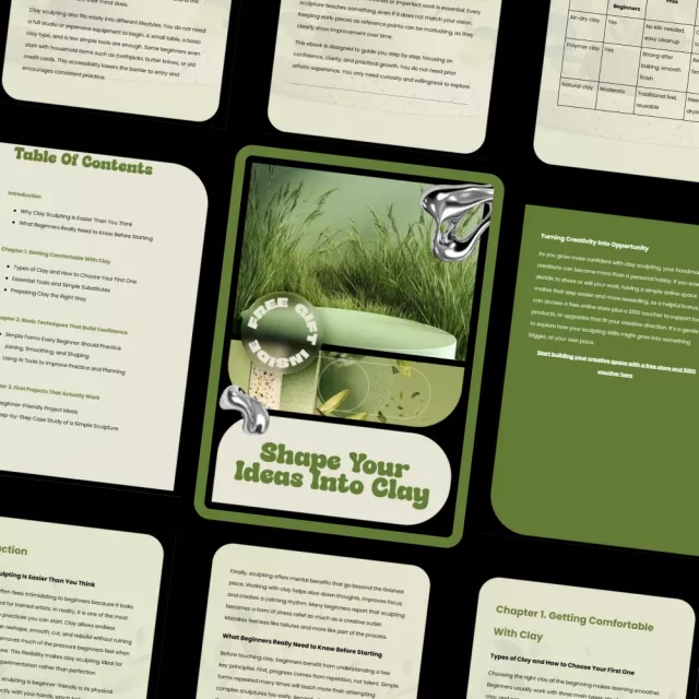 Have you ever looked at a piece of clay and felt inspired, but also unsure where to begin? Shape Your Ideas Into Clay is a beginner-friendly ebook designed to gently guide you from curiosity to confidence. This digital guide breaks down clay sculpting into simple, achievable steps so you can stop overthinking and start creating. With clear explanations, practical exercises, and encouraging guidance, this ebook proves that clay sculpting is easier and more enjoyable than you might think.