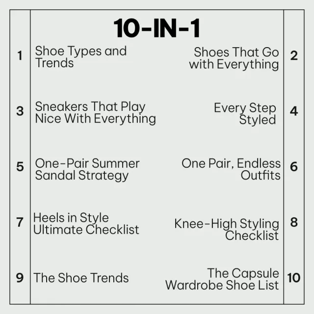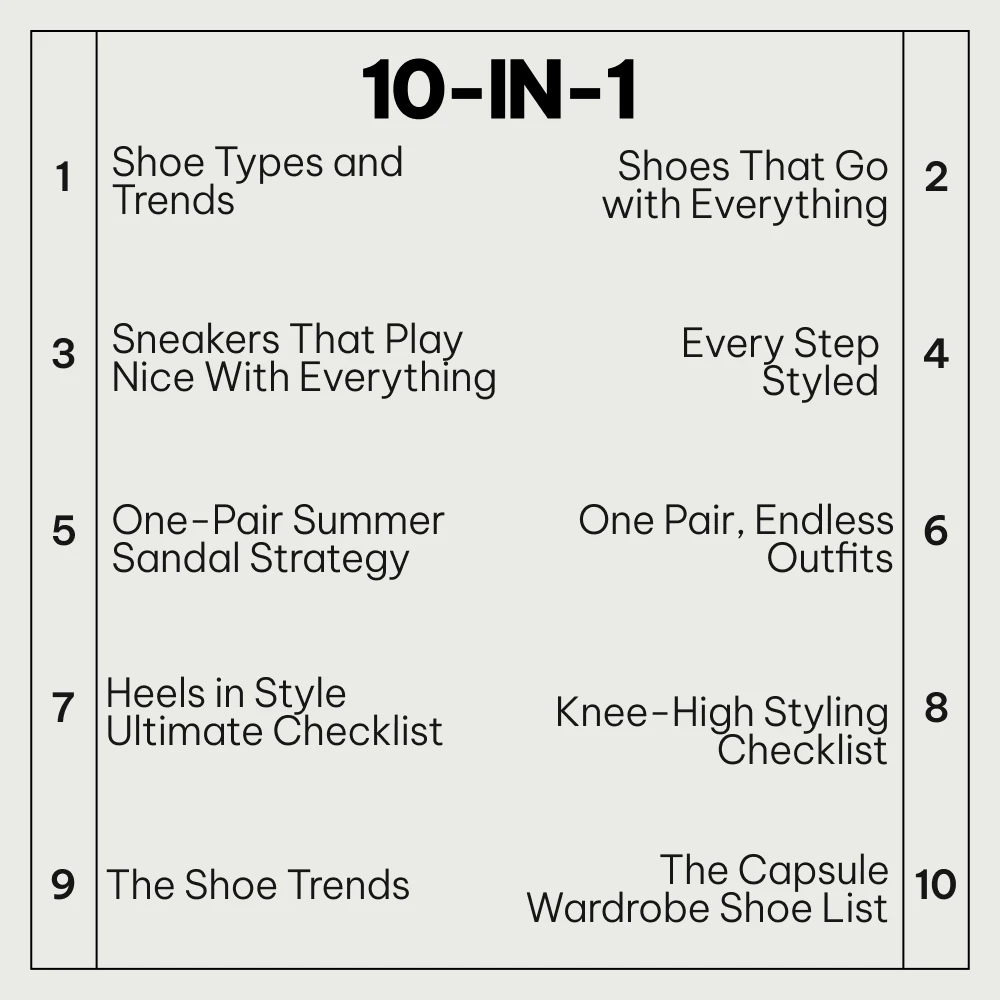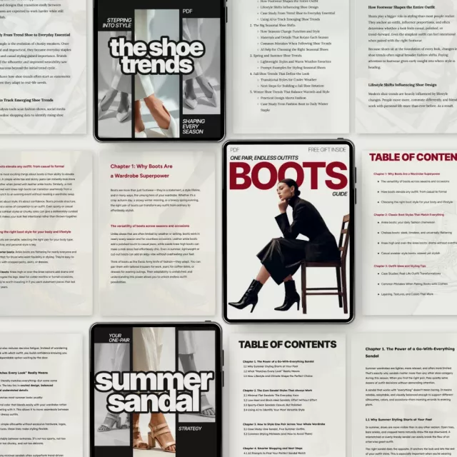 I really enjoy this bundle—there are so many fantastic ideas, especially for the boots and heels sections. The knee-high boot checklist was a game changer for me, and the sneaker section gave me so many new ways to style casual shoes. However, I found the “Summer Sandal Strategy” to be a little basic. It’s still good advice, but I expected something more creative. Despite that, it’s an excellent resource for any shoe lover!