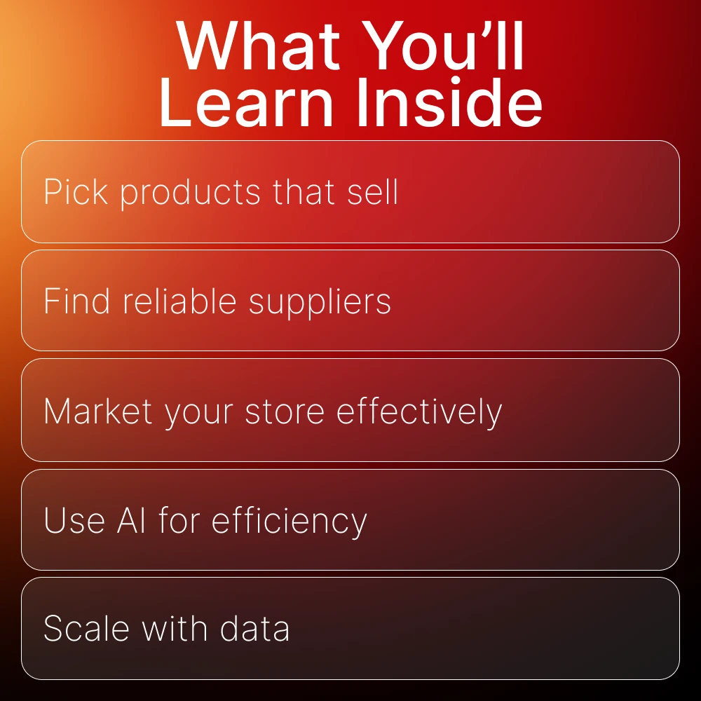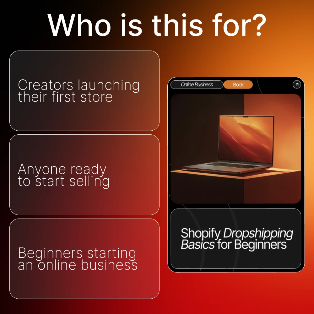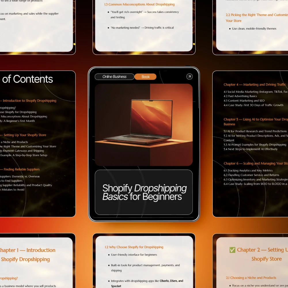 Unlike long, complicated courses, this eBook delivers a clear and actionable plan focused entirely on shopify dropshipping basics for beginners. It combines essential business setup advice, marketing guidance, and modern AI tools to help you work smarter, not harder—no fluff, just results.