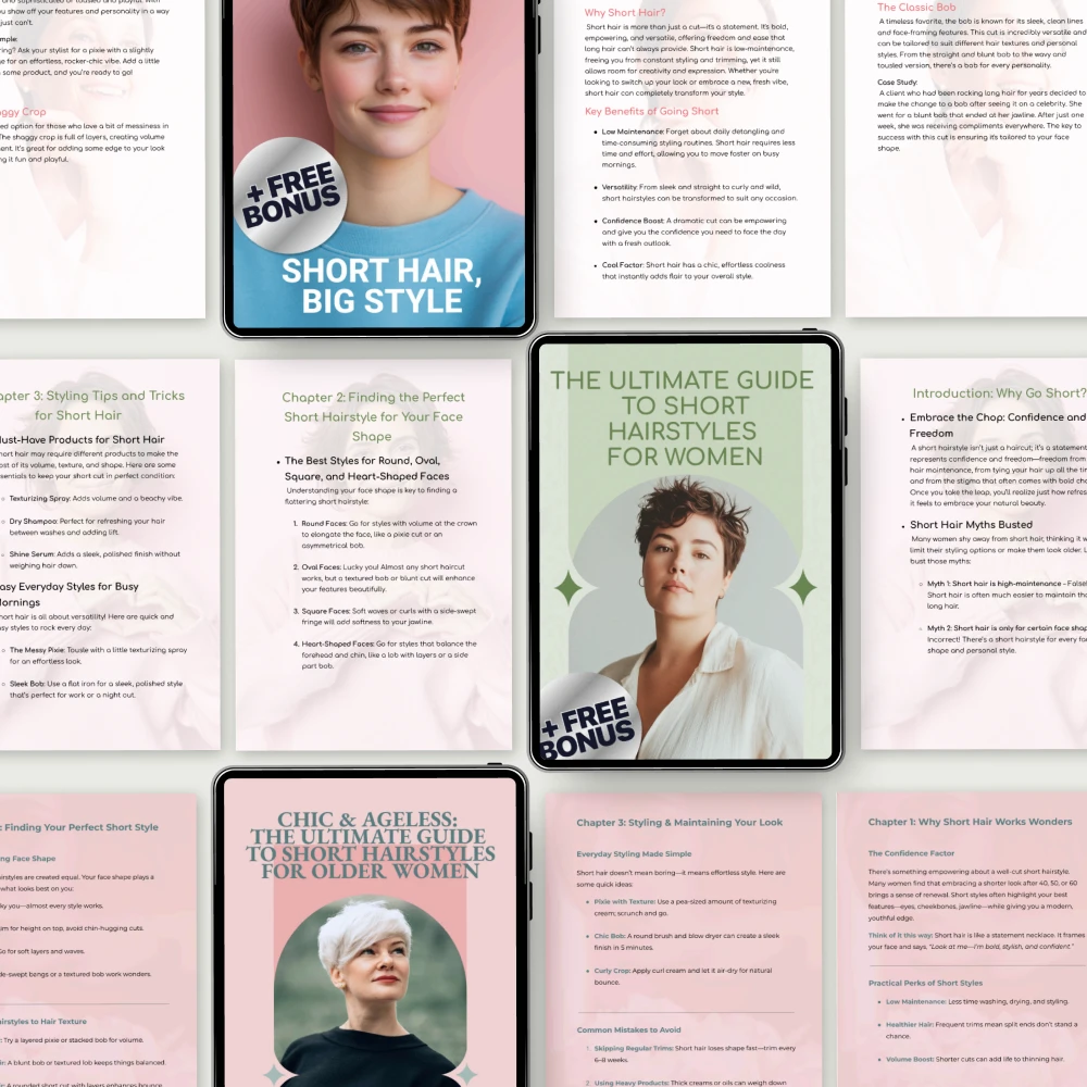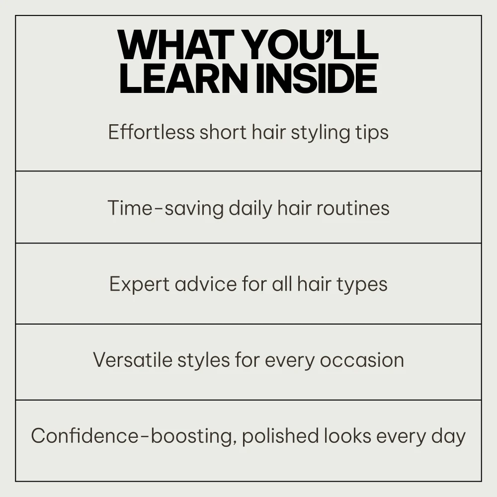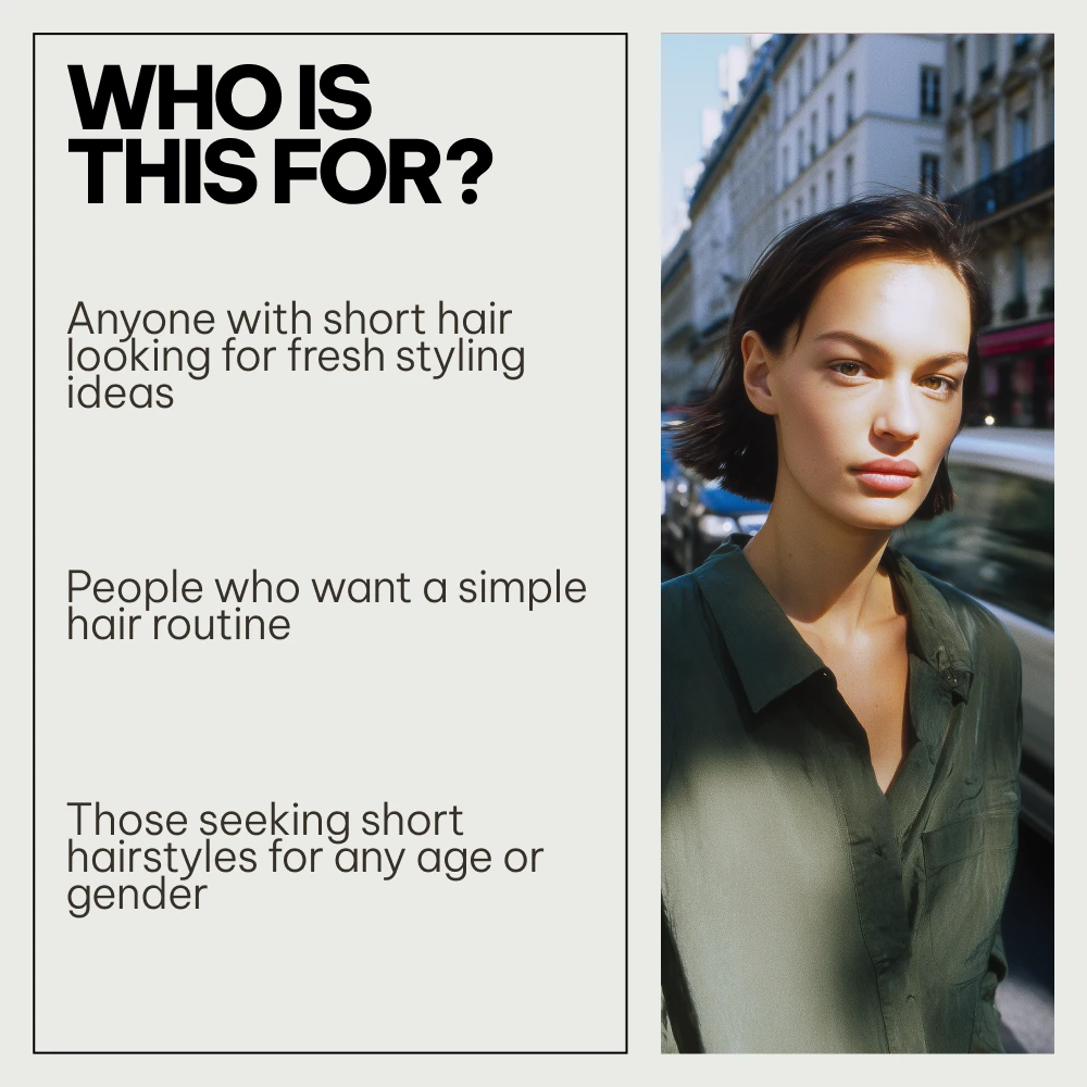 This toolkit is perfect for anyone with short hair who wants to step up their styling routine. Whether you’re a woman, man, or an older woman, you’ll find practical advice and inspiration to create short hair looks that suit your lifestyle and personality. It’s ideal for those who want a simple yet effective routine that guarantees stunning results every time.
