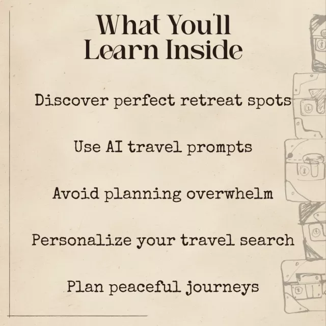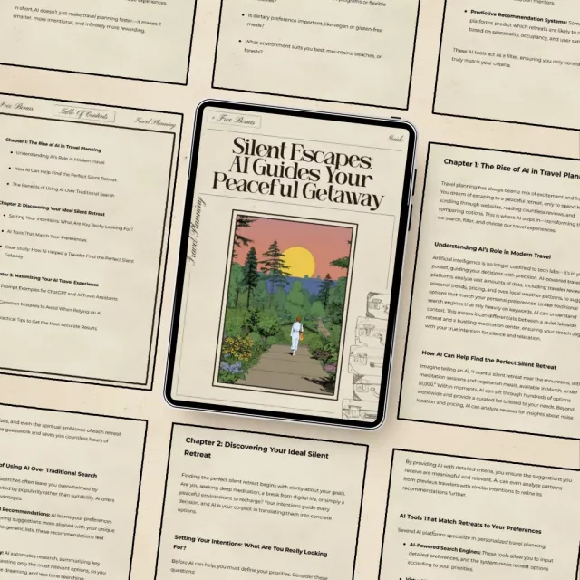 Unlike traditional travel guides, Silent Escapes pairs timeless human needs—rest, quiet, and renewal—with the intelligence of AI technology. It doesn’t just list retreats; it teaches you how to interact with AI to uncover meaningful, restorative destinations built around your preferences. The result? Every journey feels intentional, peaceful, and deeply personal.