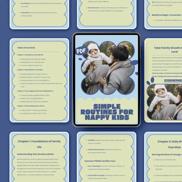 Creating a peaceful family life doesn’t require perfection—it requires intention. Simple Routines for Happy Kids is a practical, easy-to-follow digital guide designed to help families replace chaos with consistency and connection. If you’ve ever wondered what family routines help kids thrive, this guide gives you clear answers and realistic strategies you can start using right away. With gentle structure, real-life examples, and modern tools, this guide supports parents who want happier kids and smoother days without overwhelm.