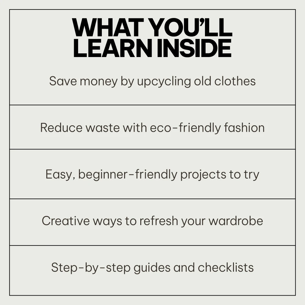 This 4-in-1 bundle is not just another guide—it’s a complete toolkit for anyone interested in upcycling clothes for beginners. What sets it apart from other resources is its beginner-friendly approach. The step-by-step instructions are easy to follow, and the included checklists and ideas make it simple to start transforming your old clothes into something new. Plus, you’ll learn practical tips for styling and upcycling clothes that will fit into your lifestyle and budget.