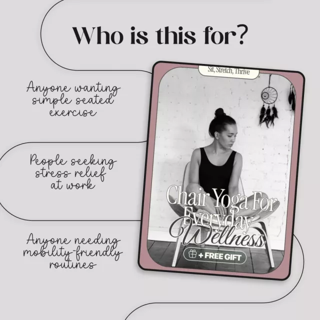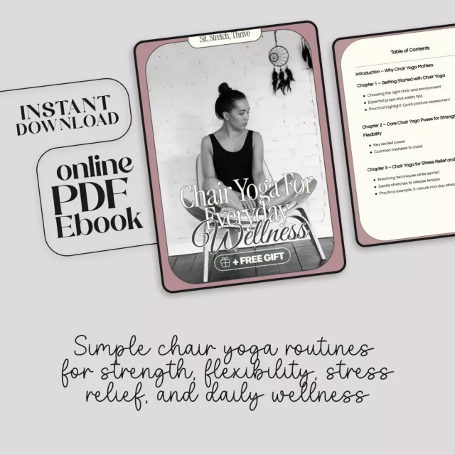 Take the first step toward everyday wellness with Sit, Stretch, Thrive: Chair Yoga for Everyday Wellness. Download your copy today and bring the benefits of chair yoga into your daily routine—anytime, anywhere.