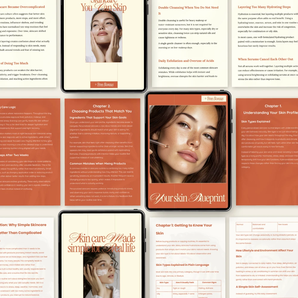 • Your Skin Blueprint – A step-by-step framework to understand your skin’s needs and make smarter skincare decisions.