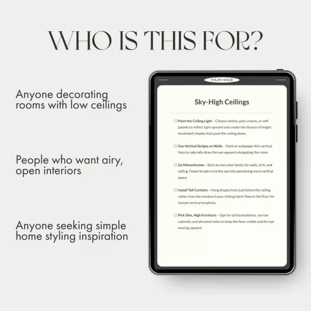 Unlike generic decorating guides, this digital download focuses exclusively on visual height and ceiling perception. It’s concise, visually clear, and filled with designer-approved strategies that work in any space—small or large. Each tip is easy to implement and proven to deliver impressive, camera-ready results.