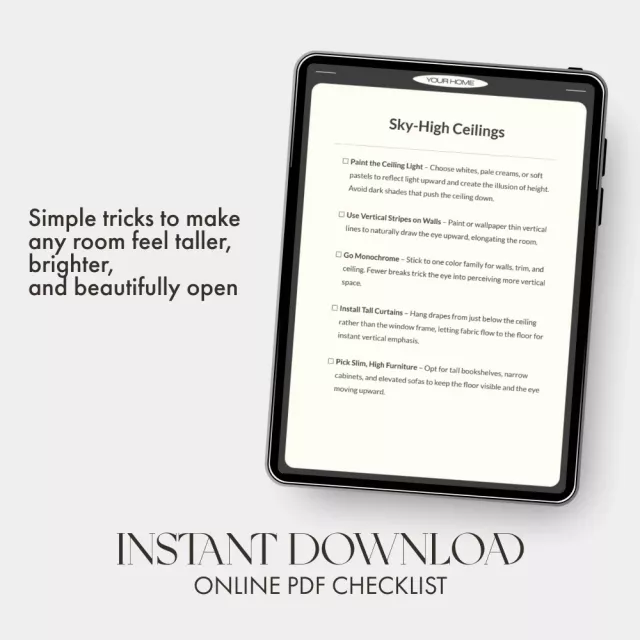 Dreaming of spacious, airy rooms that feel light and open? Sky-High Ceilings is the ultimate digital checklist for anyone who wants to learn how to make your ceiling look higher—without major renovations or expensive remodels. This beautifully designed, easy-to-follow guide walks you through simple yet powerful design techniques that instantly elevate your space. Whether you’re decorating a cozy apartment, refreshing a living room, or staging a home for sale, these expert tips help you achieve the elegance and vertical balance of a designer interior.
