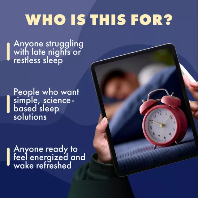 This digital guide is for anyone who struggles with irregular sleep patterns—students, professionals, shift workers, or anyone ready to create healthier routines. Unlike generic sleep tips, this workbook provides a step-by-step system you can personalize to your lifestyle.