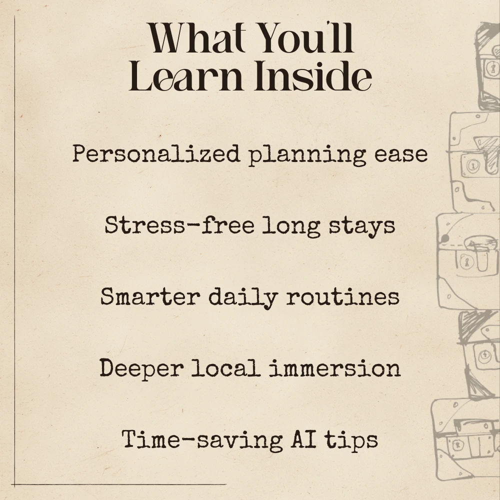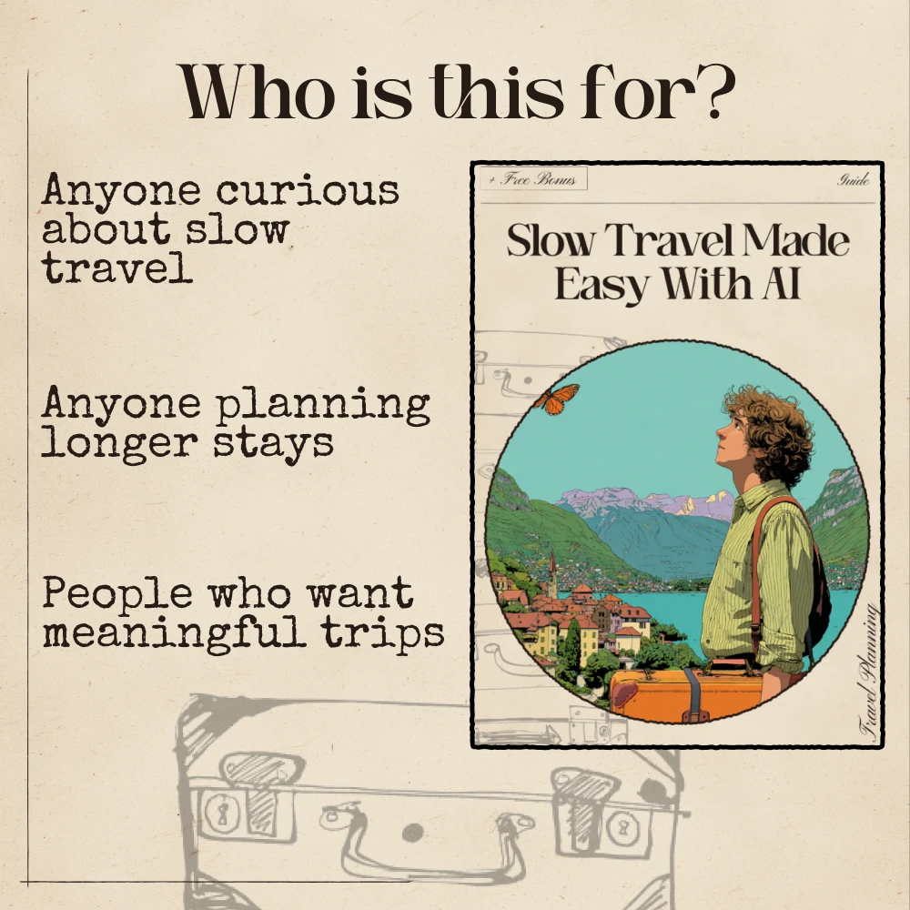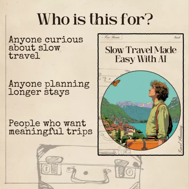 Unlike generic travel guides, this resource blends modern technology with the heart of slow travel. It teaches you not just where to go, but how to think, plan, and live during a long stay—using AI in a way that remains human, grounded, and personal. You get actionable examples, proven strategies, and a complete framework for designing transformative travel experiences.