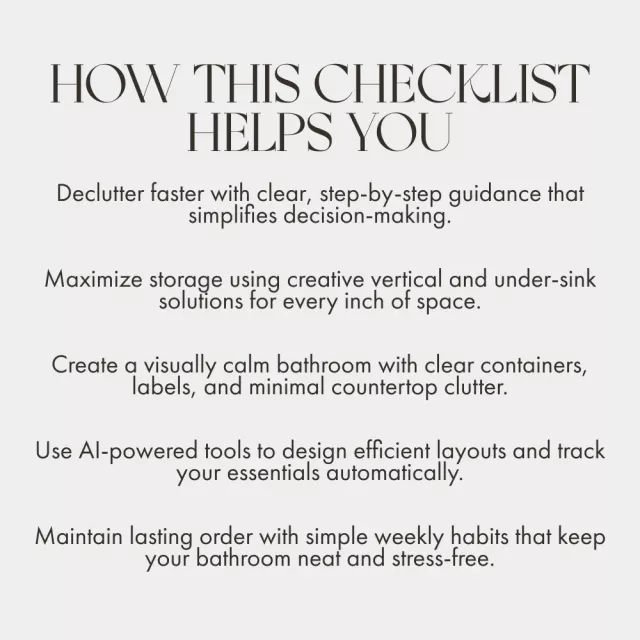 Unlike other checklists, this one blends practical organization with modern technology, offering a unique section on AI-powered tools to help you visualize and plan your bathroom layout. It’s not just a guide—it’s a smart solution for modern living. Each section is designed to inspire quick wins and lasting habits, so you can enjoy a peaceful, efficient bathroom every day.