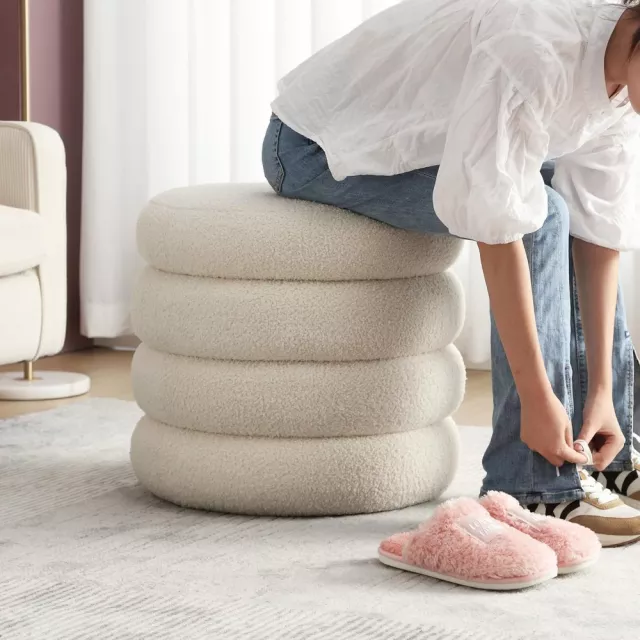 Upgrade your living space with the charming and functional Small Boucle Storage Ottoman. Wrapped in plush off-white Sherpa fabric, this modern round footstool is more than just a cozy seat — it’s a smart storage solution designed to keep your home looking stylish and organized. Its minimalist design pairs effortlessly with any room décor, whether it’s a chic bedroom, a serene reading nook, or a modern vanity setup.