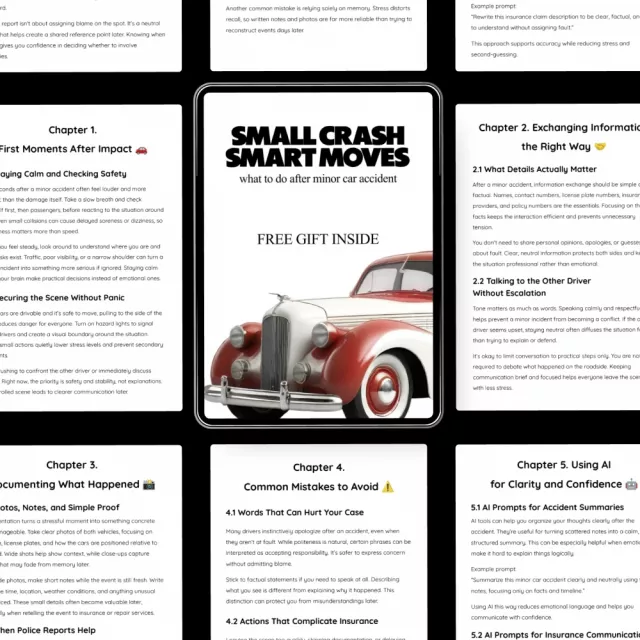 Unlike generic accident checklists, this guide focuses on real-world behavior, communication, and clarity. It even includes modern AI prompts to help you organize your thoughts and talk to insurance companies confidently. Itβs not just theoryβitβs practical, calm, and human.