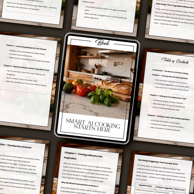 Who knew that AI could be such a game-changer in the kitchen? This eBook is more than just a guide, it's an entire culinary journey. It's like having a personal chef who knows your taste and dietary preferences inside out. And let's not forget about the smart kitchen tips - they're practical, easy-to-implement and have made my time in the kitchen so much more efficient. But what truly sets this eBook apart are its food waste solutions – simple yet effective strategies that ensure nothing goes to waste. Not only am I eating better, but I'm also contributing less to food wastage which feels great!