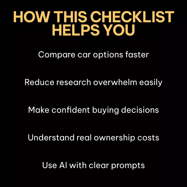 Unlike generic car-buying guides, this checklist focuses on decision clarity. It doesn’t just tell you what to compare, it shows you how to ask better questions, spot meaningful differences, and understand why those differences matter. The included AI prompts turn vague research into actionable insights you can actually trust.