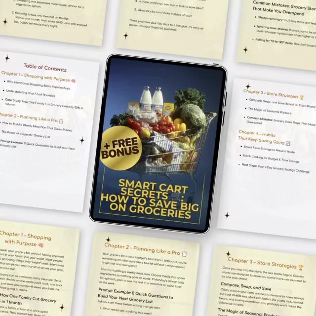 Groceries don’t have to drain your wallet. Smart Cart Secrets 🛒: How to Save Big on Groceries is a practical, easy-to-follow digital guide designed to help you shop smarter, waste less, and finally feel in control of your grocery budget. If you’ve ever walked out of the store wondering where your money went, this guide shows you exactly how to save money on groceries without extreme couponing, complicated systems, or sacrificing the foods you love.