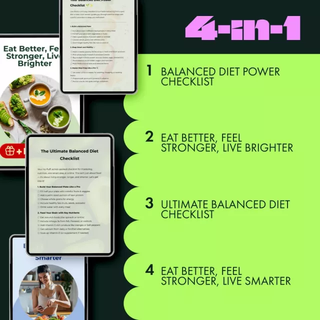 Are you ready to transform the way you eat and feel your best every day? The Smart Choices for Balanced Eating Bundle is your ultimate toolkit for mastering balanced diet food and unlocking your body’s full potential. Packed with 4 comprehensive digital resources, this bundle provides everything you need to eat smarter, feel stronger, and live brighter. Whether you’re just starting your healthy eating journey or looking to refine your habits, these guides, eBooks, and checklists will empower you to make sustainable, positive changes.