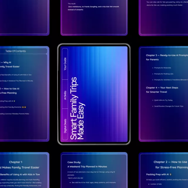 • Chapter 3 — Ready-to-Use AI Prompts for Parents: Pre-written prompts for itineraries, packing lists, activities, and smooth transitions between events.
