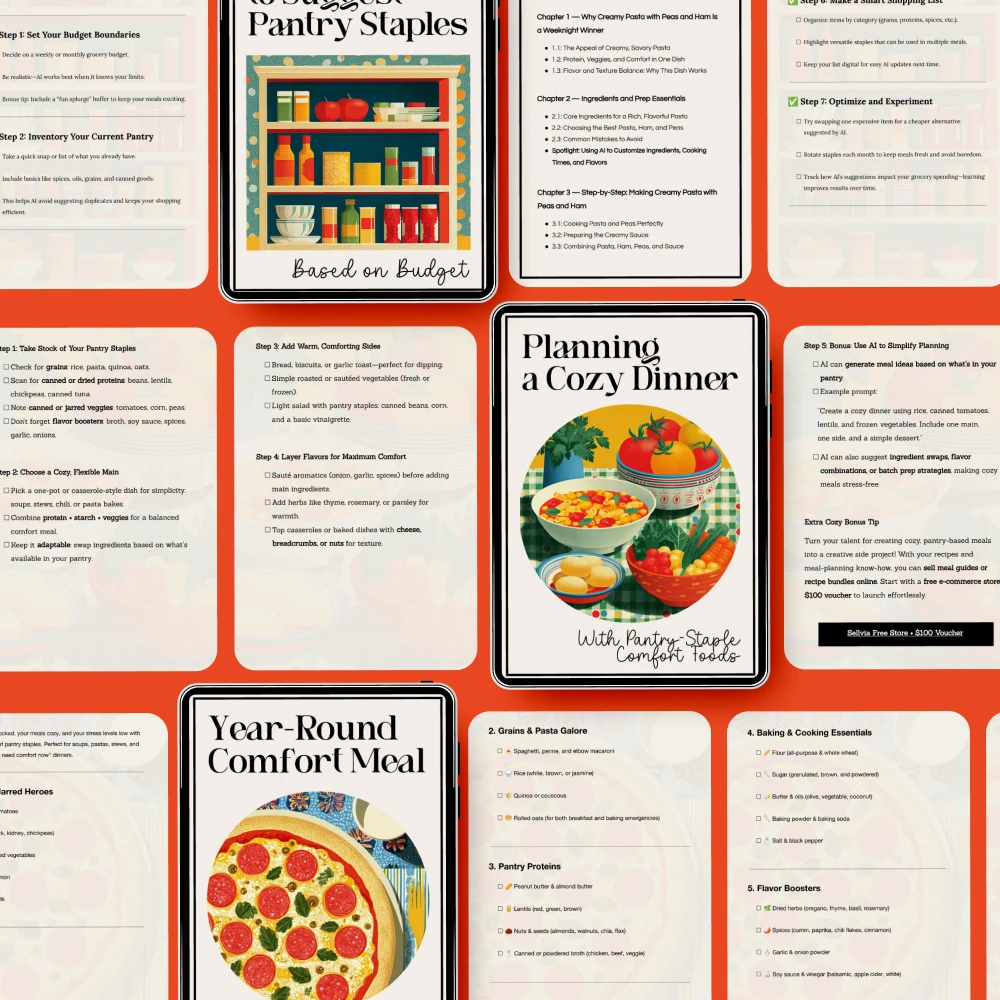 Say goodbye to last-minute dinner dilemmas and hello to stress-free, comforting meals all year round with the Smart Pantry Kit for Cozy Meals. This 3-in-1 digital bundle is designed to help you master the art of cozy, home-cooked meals with pantry staples that are easy to keep on hand. Whether you’re a busy professional or a home cook looking for inspiration, this kit is your go-to resource for creating hearty, delicious dishes on a whim. It’s time to unlock the secrets to delicious comfort food that’s always ready, whenever you are!