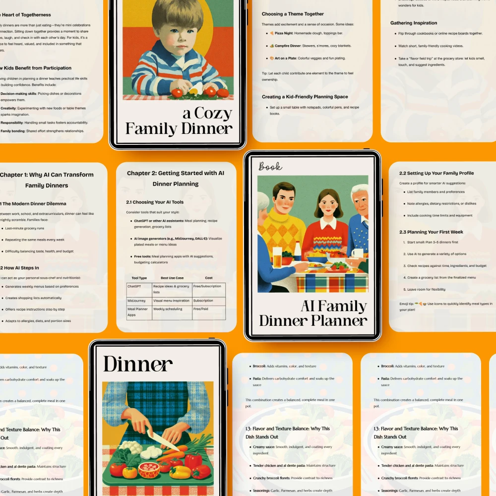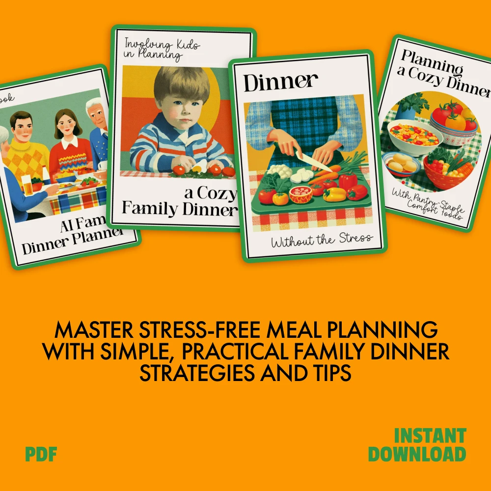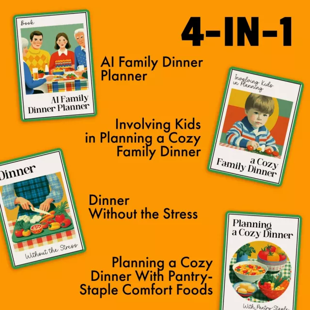Whether you’re a busy parent or someone who simply wants to make family dinners a little easier, this bundle is the perfect solution for creating delicious meals without the hassle. The AI Family Dinner Planner will save you time and energy by automatically suggesting meal ideas based on your available ingredients, while Involving Kids in Planning a Cozy Family Dinner will help you create a fun family activity that everyone can enjoy. Plus, with expert tips from Dinner Without the Stress and Planning a Cozy Dinner With Pantry-Staple Comfort Foods, you’ll have everything you need to cook up meals that bring everyone together—no stress required.