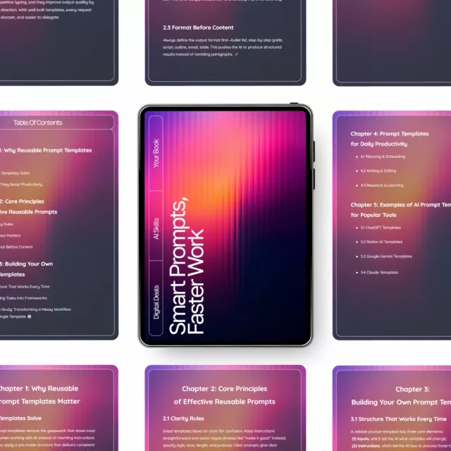 Unlike generic AI guides, Smart Prompts, Faster Work doesn’t just give examples—it teaches you the underlying structure behind great prompts. You’ll learn how to design templates that work across tools, tasks, and goals, making this guide a long-term resource instead of a one-time download. Every chapter is practical, easy to apply, and built to help you master reusable prompt templates for productivity in your daily work.