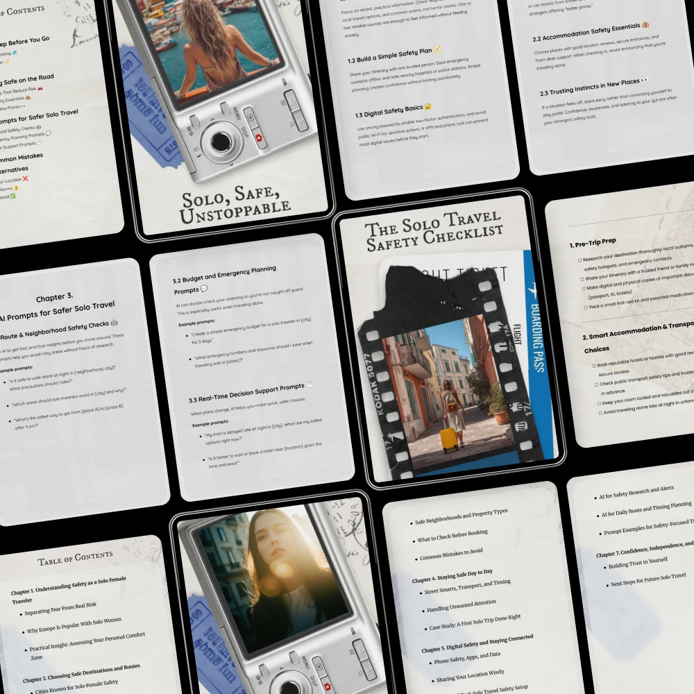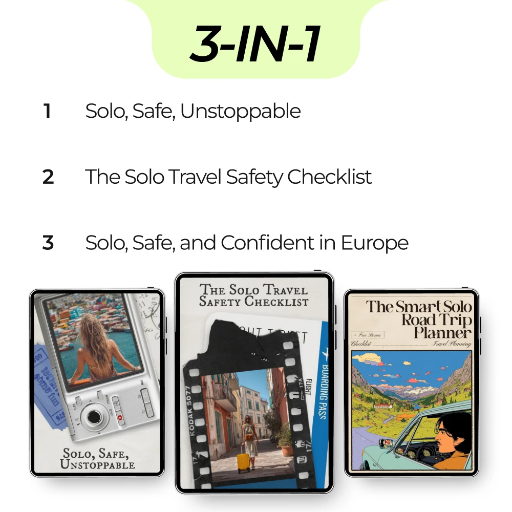 Don’t leave your safety to chance! The Smart Safety Bundle for Solo Adventures will help you feel confident and prepared, no matter where your travels take you. Download your bundle now and take the first step towards safer, more enjoyable solo adventures.