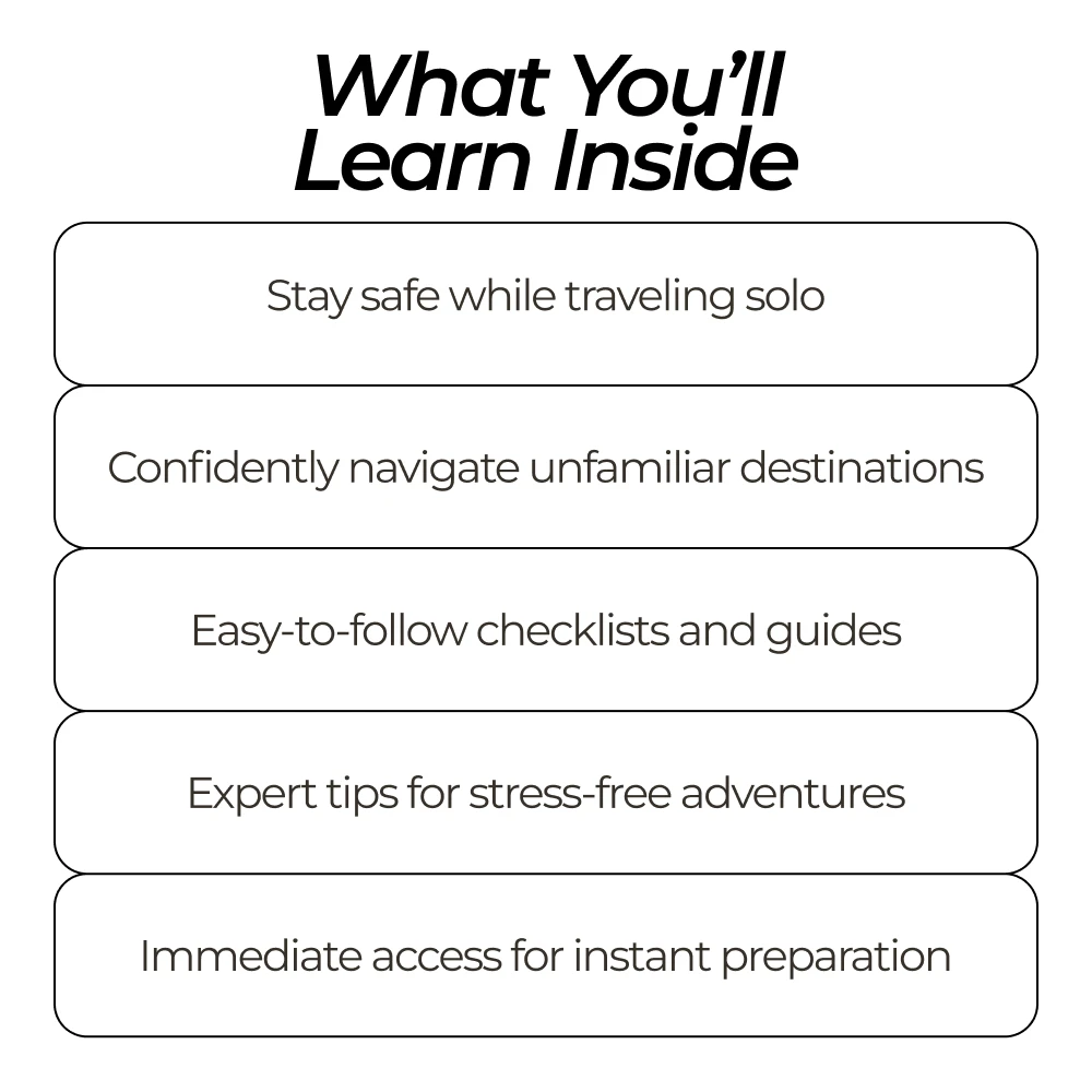 Just got back from my first solo trip and this bundle was my best companion! It's packed with practical tips that made me feel safe and confident. The checklist is super detailed, it covered everything I needed to think about before and during the trip.
