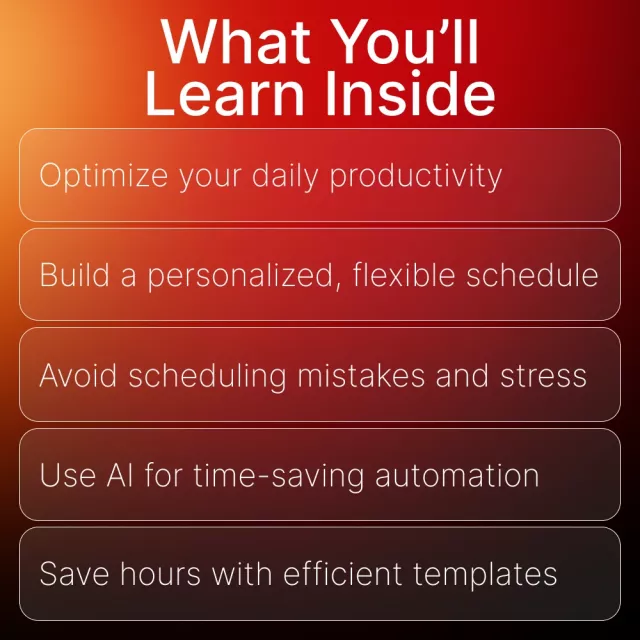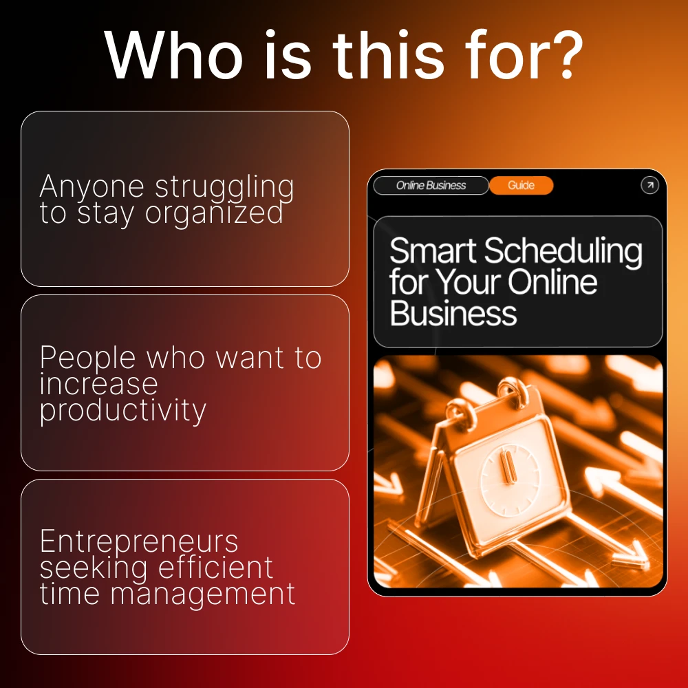 This guide is perfect for online business owners, entrepreneurs, and digital creators who struggle to manage their time effectively. If you’re juggling multiple tasks or feeling overwhelmed by your to-do list, this guide will help you take control and create a schedule that works for your unique needs. Whether you’re a solopreneur or managing a growing team, the strategies in this guide will help you improve your time management and achieve better results.