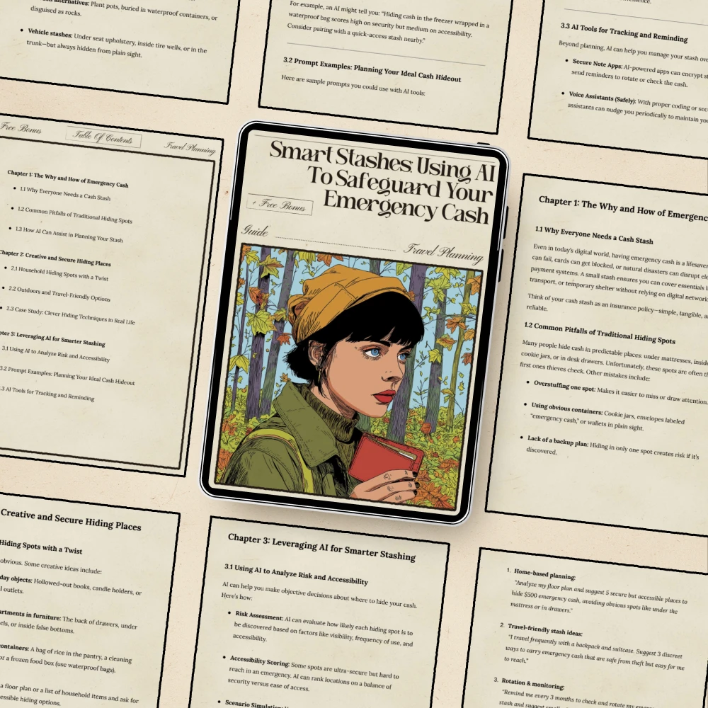 Protecting your backup cash shouldn’t feel stressful or uncertain. Smart Stashes: Using AI to Safeguard Your Emergency Cash is a practical, easy-to-follow guide that teaches you how to hide, organize, and secure your emergency money using creative methods supported by modern technology. Whether you live alone, travel often, or simply want extra peace of mind, this guide blends real-life strategies with intelligent tools—showing you how to use ai for emergency cash stash hiding places in a safe and simple way. If you’ve ever worried about losing track of your stash or choosing the wrong hiding spot, this is the resource that makes planning effortless.