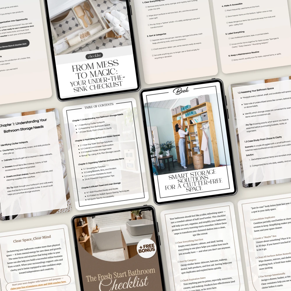 If you’re tired of bathroom clutter and need practical ways to organize your space, this 3-in-1 digital bundle is the answer. Packed with helpful guides, checklists, and expert tips, it’s the perfect solution for anyone looking to create a tidy, organized bathroom. Whether you’re struggling with a cramped under-the-sink area or want to revamp your entire bathroom storage strategy, this bundle has everything you need to get started. With simple, actionable steps, you’ll be on your way to a stress-free, clutter-free bathroom in no time!