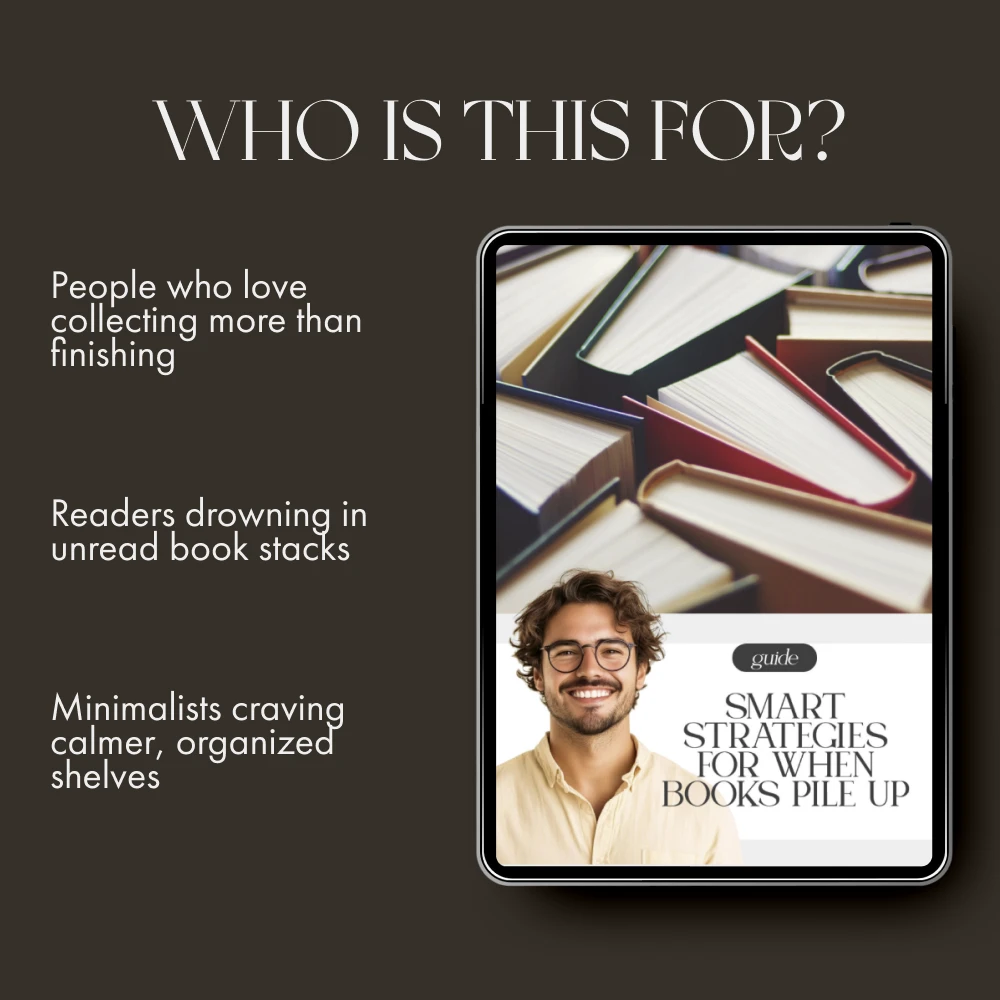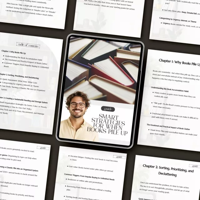 Unlike other decluttering ebooks, Smart Strategies for When Books Pile Up goes beyond surface organization. It blends practical sorting techniques with mindset shifts, emotional awareness, and smart digital tools to help you stay organized long-term. Every chapter feels like friendly guidance from someone who understands both your love of books and your desire for order.