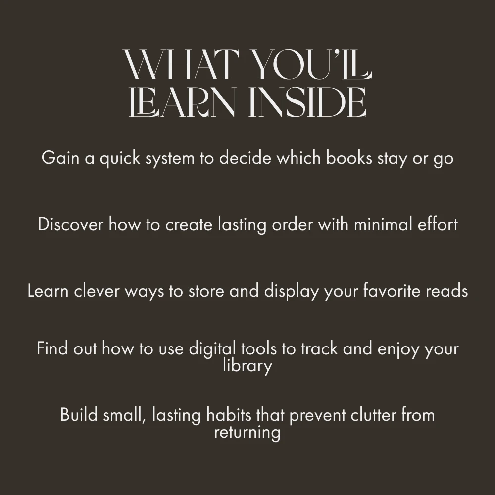 • Chapter 1: Why Books Pile Up – Understand the deeper habits behind book accumulation and the emotional weight of clutter.