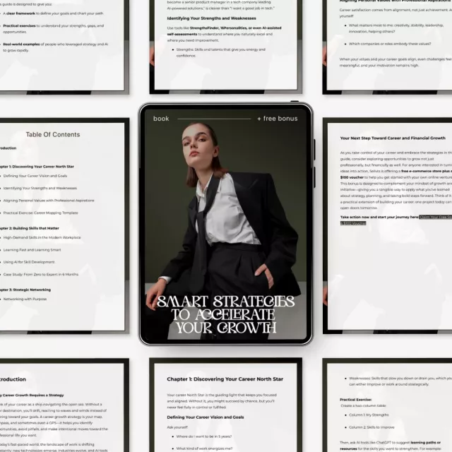 Unlike generic career guides, this ebook blends mindset, skill growth, strategic networking, personal branding, and AI tools into one unified growth strategy for career system. You’re not just learning theory — you’re given exercises, templates, AI prompts, and real case studies to apply immediately. It’s not motivational fluff, it’s a structured action plan.