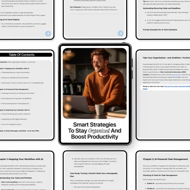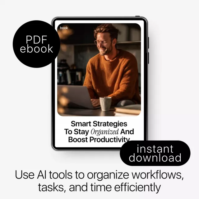 Feeling overwhelmed by endless tasks, emails, and digital clutter? Smart Strategies to Stay Organized and Boost Productivity is a practical, easy-to-follow eBook designed to help you regain control of your time using modern AI tools. This digital download walks you step by step through smarter systems, clearer workflows, and realistic routines—without complicated jargon or tech overwhelm. Whether you’re new to AI or already experimenting, this guide shows you exactly how to turn artificial intelligence into your personal organization assistant.