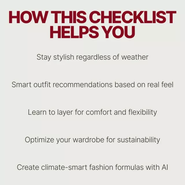This digital checklist is perfect for anyone who wants to look good and feel comfortable in any weather. Whether you’re constantly on the go, managing your day between different environments, or simply love experimenting with AI-powered fashion, Smart Style, Any Weather is for you. Fashion-forward individuals, busy professionals, travelers, and sustainability enthusiasts will all find value in these practical tips for smart, climate-conscious dressing.