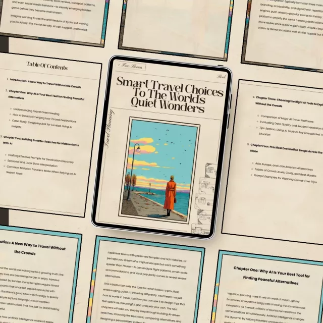 Discover a new, smarter way to explore the world with Smart Travel Choices to the World’s Quiet Wonders, an inspiring and practical ebook designed for travelers who crave meaningful experiences without the crowds. Blending expert insights with the power of ai for less crowded alternatives to popular spots, this guide shows you how to plan peaceful, authentic journeys anywhere in the world. Whether you’re tired of overtouristed destinations or simply want to stretch your travel budget while finding more serene experiences, this digital resource gives you the tools to travel smarter—not harder.