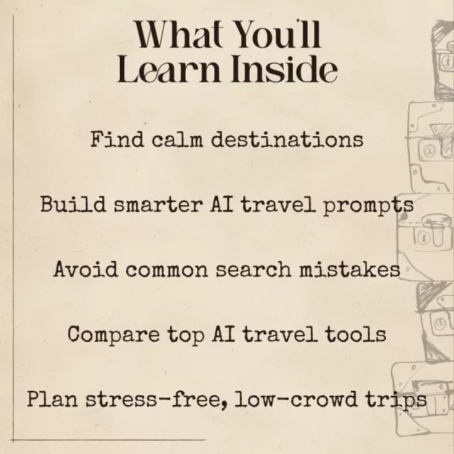 Unlike generic travel guides, this ebook teaches you how to use AI itself as a travel advantage. With real prompt examples, case studies, and global alternatives, it empowers you to choose better destinations—not just follow trends.