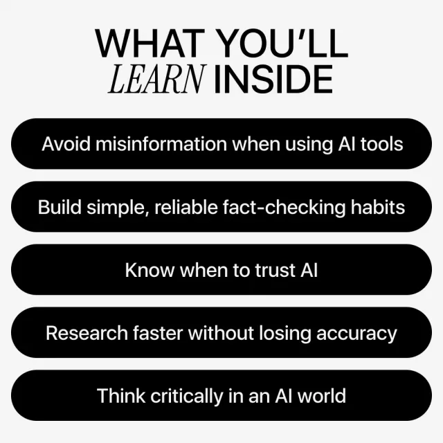 Unlike generic AI guides, this eBook focuses on thinking habits, real-world workflows, and clear judgment—not technical jargon. It doesn’t tell you to fear AI or blindly trust it. Instead, it teaches balance, clarity, and practical verification skills you can apply immediately.