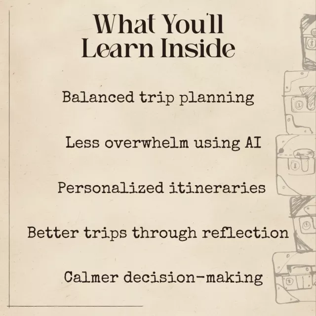 • Teaches you AI prompts and tools you can use immediately for any trip.