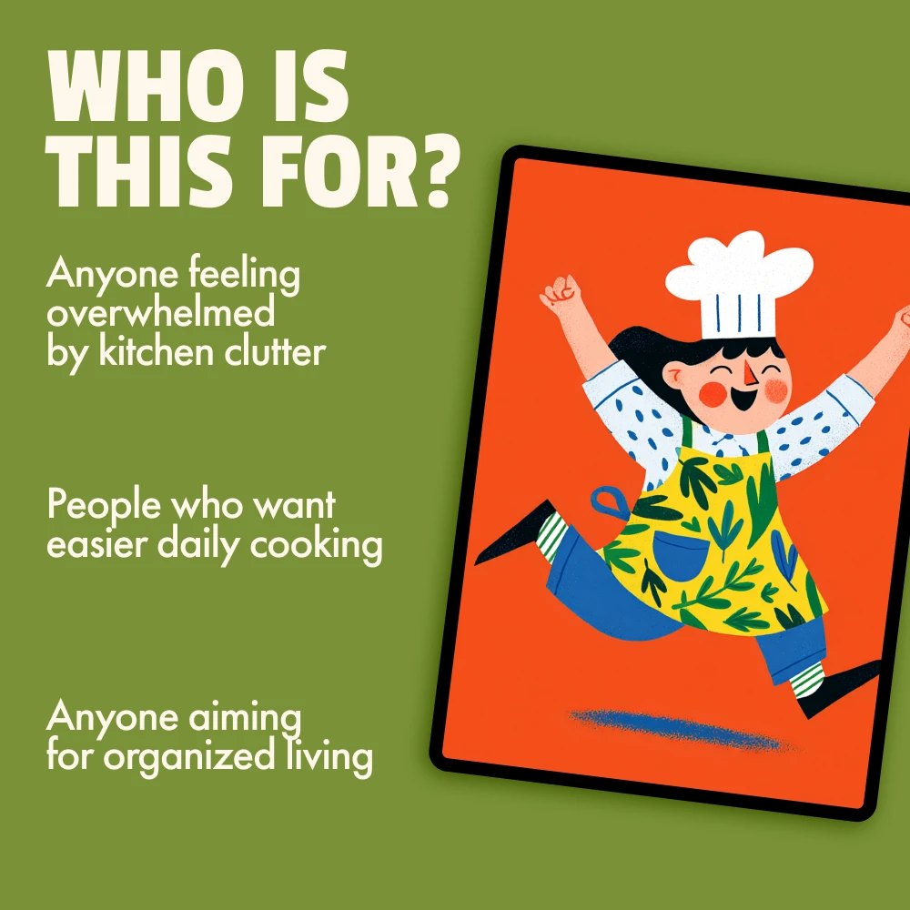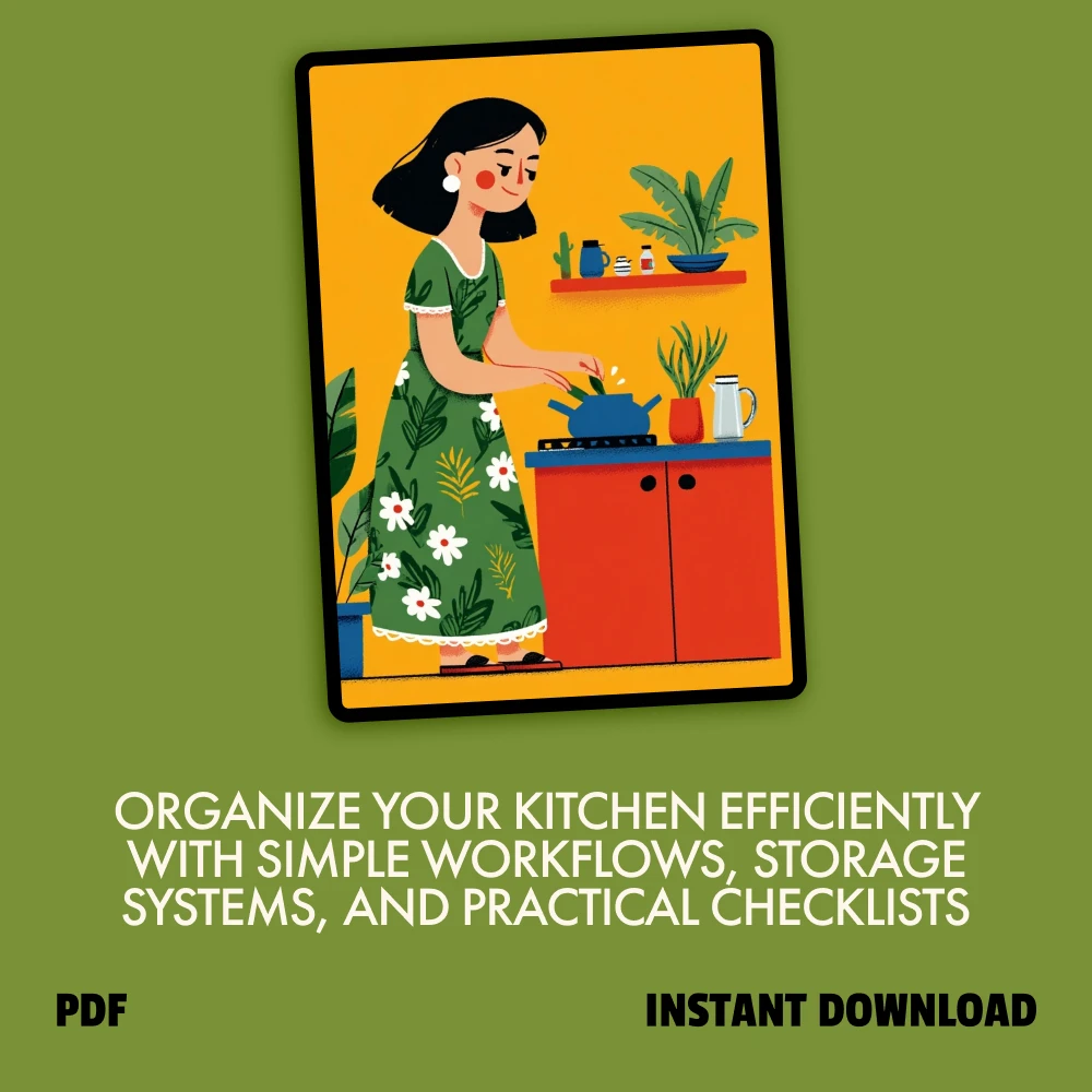 This bundle is ideal for home cooks, busy families, apartment dwellers, and anyone who wants a more organized kitchen without expensive renovations. Unlike generic organizing guides, this kit focuses on workflow, habits, and real-life usability. It doesn’t just tell you where to put things; it shows you why, so your systems actually last.