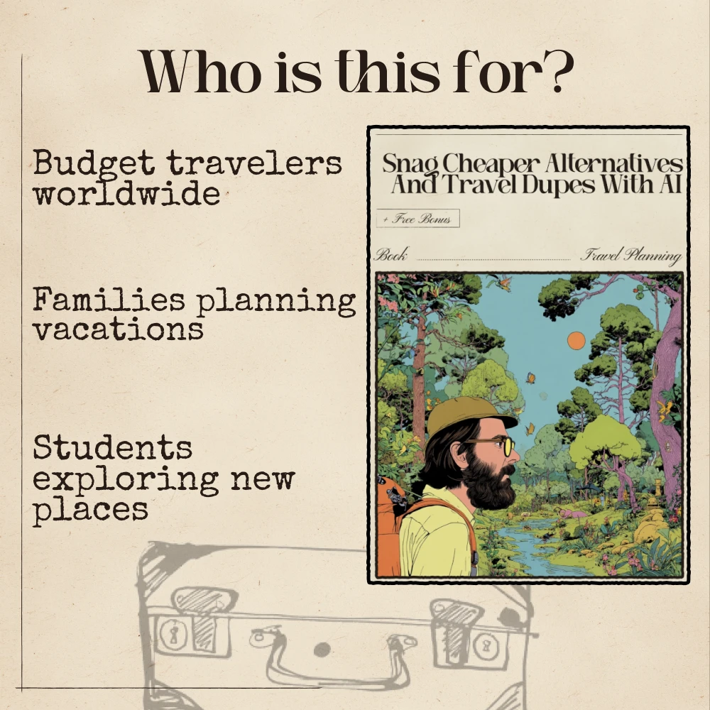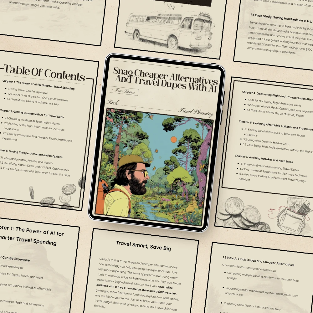 Unlike generic budget travel guides, this eBook focuses entirely on ai to find travel dupes cheaper alternatives. It’s designed to help you master AI tools, prompts, and strategies that uncover deals most travelers miss. With real-world case studies and easy-to-follow steps, it’s your shortcut to affordable adventures without compromise.