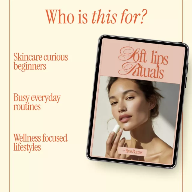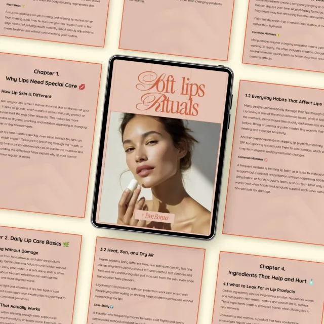 This ebook is perfect for anyone who wants softer lips without complicated routines, from beginners to skincare lovers who want clarity. Unlike generic guides, Soft Lips Rituals combines education, ingredient awareness, seasonal guidance, and AI-powered personalization into one cohesive resource. It focuses on building habits, not perfection.