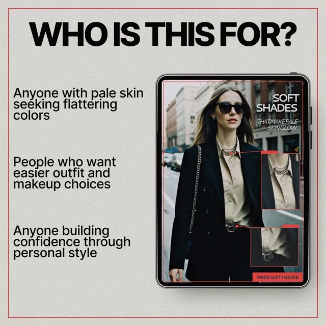 This guide is perfect for anyone with pale skin who wants clearer answers about color choices—whether you love fashion, feel stuck with neutrals, or struggle to find shades that feel flattering. It’s ideal for beginners, busy professionals, and anyone seeking simple, modern style guidance without rigid rules.