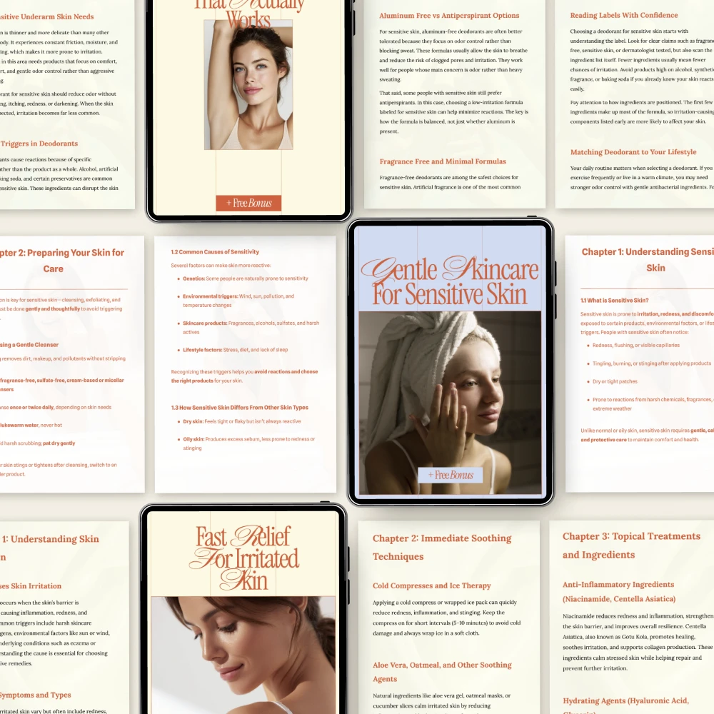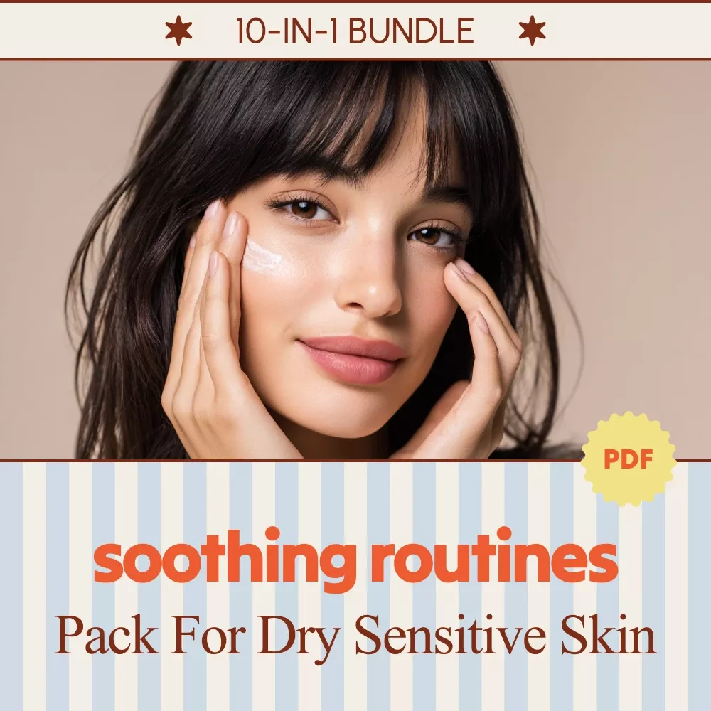 If your skin reacts to everything, this bundle was created with you in mind. The Soothing Routines Pack for Dry Sensitive Skin is a thoughtfully designed 10-in-1 digital bundle that helps you build a truly supportive skincare routine for sensitive skin—without the guesswork. Inside, you’ll find practical guides, easy-to-follow eBooks, and calming checklists that focus on relief, prevention, and long-term skin comfort. Whether you struggle with redness, irritation, razor burn, or dryness, these resources guide you step by step toward calmer, healthier-looking skin.