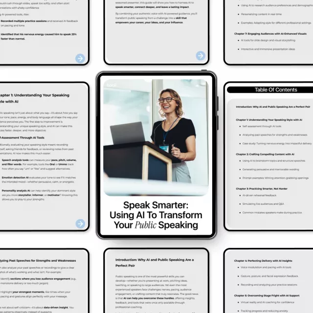 Unlike generic public speaking books, this digital download focuses specifically on using AI as a practical, everyday tool. You’ll find real prompt examples, modern practice methods, and actionable steps that grow with you as your skills improve.