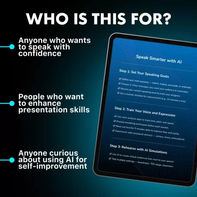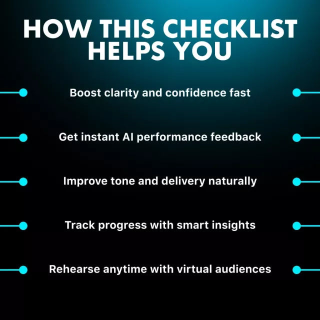 Unlock the full potential of your voice and presence today. Download the Speak Smarter with AI checklist and start your journey toward confident, captivating communication. Learn how to use AI to practice public speaking — and let technology help you shine every time you speak!