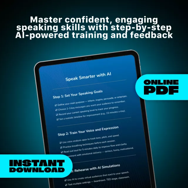 Step confidently onto any stage with Speak Smarter with AI — a powerful, easy-to-follow digital checklist designed to help you master public speaking using the power of artificial intelligence. Whether you’re preparing for a presentation, TED-style talk, or classroom speech, this downloadable guide shows you how to use AI to practice public speaking effectively and efficiently. With structured steps, smart prompts, and actionable tasks, you’ll gain the tools to communicate clearly, confidently, and with authentic presence.