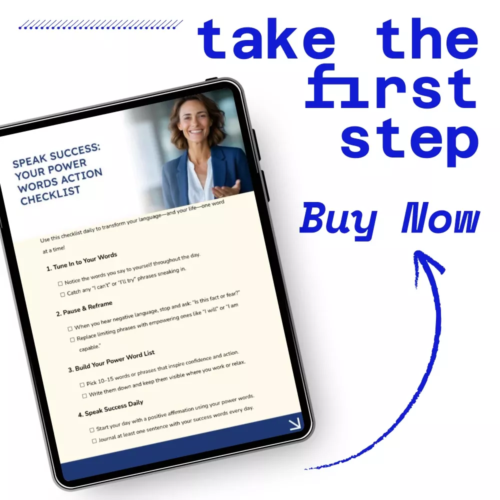 Words shape thoughts. Thoughts shape actions. Speak Success: Your Power Words Action Checklist is a simple yet powerful digital checklist designed to help you consciously change the language you use every day—starting with the words you say to yourself. This easy-to-follow resource guides you step by step to replace limiting phrases with confident, success-driven language so you can show up stronger in your work, goals, and daily life. If you are ready to build momentum using powerful words for success, this checklist gives you a clear daily structure to do exactly that.