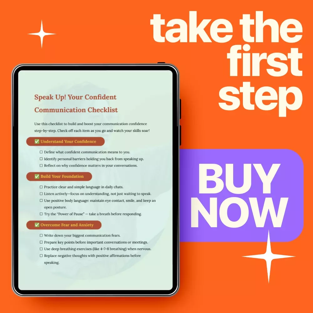 Ready to stop holding back and start speaking up with confidence? Download Speak Up! Your Confident Communication Checklist today and take the first step toward stronger, clearer, and more confident communication—one checkmark at a time.