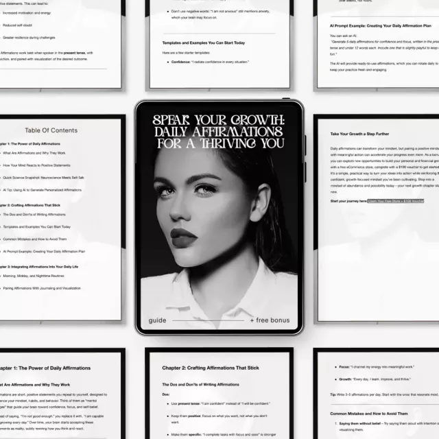 Unlock your full potential with Speak Your Growth: Daily Affirmations for a Thriving You, a comprehensive digital guide designed to help you harness the life-changing power of daily affirmations for self growth. This easy-to-follow guide combines science, psychology, and practical exercises to help you create personalized affirmations that truly stick. Whether you’re new to affirmations or looking to deepen your practice, this guide provides step-by-step instructions to integrate positive self-talk into your daily life and watch your mindset flourish.